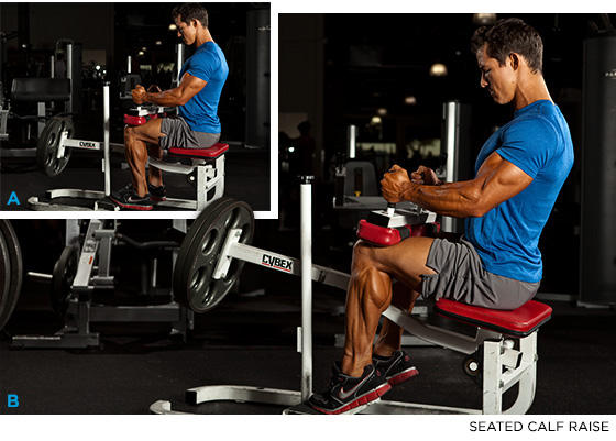Variation(s): If you don’t have a plate-loaded calf machine, you can easily replicate the movement by placing two dumbbells on top of your quads (the front half).