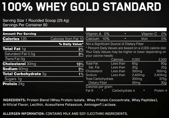 1 scoop: 120 calories, 24 g whey protein, 1 g fat, 1 g sugar, very few artificial ingredients