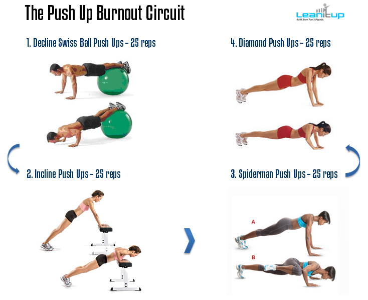 The Push Up Burnout Circuit is comprised of 4 different types of push ups, performed back-to-back in superset fashion, as a vehicle to burn out your chest, build muscular endurance, and torch calories.