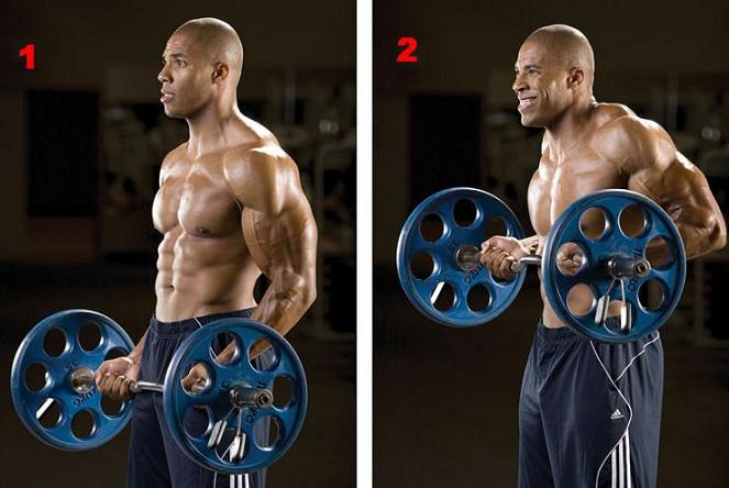 - 6. Barbell Drag Curls — drag the barbell up along your torso into the bottom of your chest. MAJOR KEY: pull your elbows back behind your torso. Squeeze at the top.