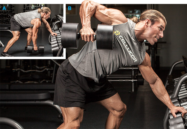 - 5. 1-Arm Dumbbell Rows — lower all the way down to the floor and pull the dumbbell up back toward your hip. Rotate a 1/4 turn at the top of each rep to expand the RoM. STRETCH your lats at the bottom.