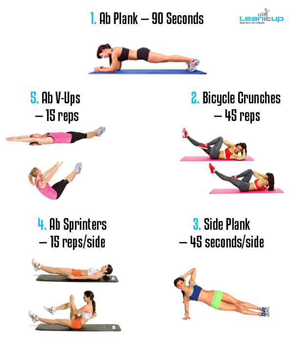 - (5) Ab V-Ups — 15 reps. Start flat on the floor with your arms extended overhead. Raise your arms and legs, contract your abs, and touch your toes overhead. It should form a “V” with your body.